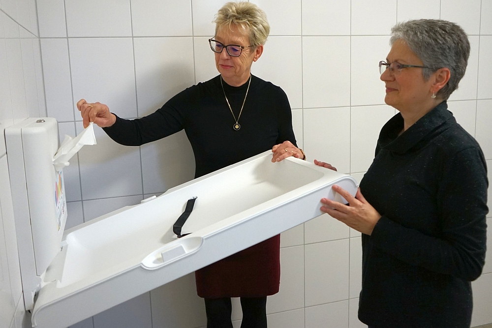 Für Familien mit kleinen Kindern gab es bisher im CvBK nur eine ausgewiesene Wickelmöglichkeit. Um auch im Säulenhaus, wo sich eine Kinderarztpraxis befindet, diese Möglichkeit anzubieten, wurde diese klappbare Wickelkommode in der Behindertentoiletten installiert.