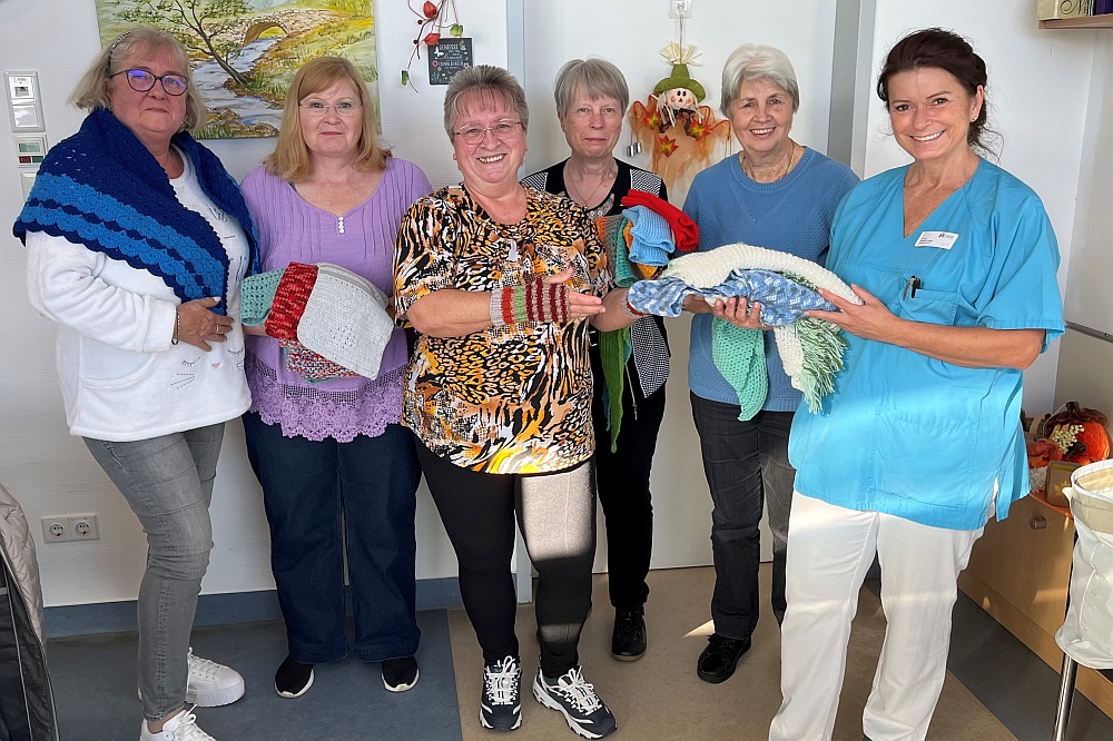 So viele Tücher, Schals, Capes, Kragen, Strümpfe, Bettschuhe, Stulpen und Pulswärmer hatten sie in den letzten Wochen für unsere Patienten der Geriatrie gestrickt. „Diese Dinge kommen bei unseren Patienten sehr gut an“, berichtet Schwester Katrin. „Wir freuen uns sehr. Auch über die Wertschätzung, die sie unseren Patienten entgegen bringen. Und es ist eine unglaubliche Leistung, was die Frauen hier für uns gestrickt haben.“