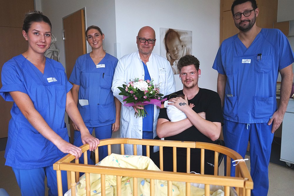 Mit einem rosa Blumenstrauß gratulierten Chefarzt Kurt Müller (Bildmitte) und sein Team der kleinen Familie.