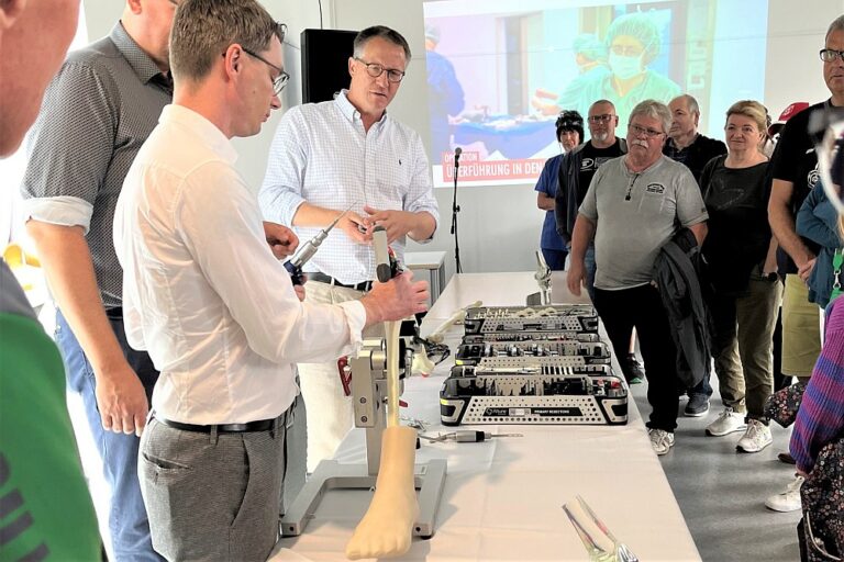 Der Leitende Oberarzt Dr. Sebastian Hagen und Chefarzt Dr. Christof Beimes erläutern an einem Operationssimulator den OP-Verlauf.Am 19.11.2025 bieten die beiden Orthopäden allen Betroffenen die