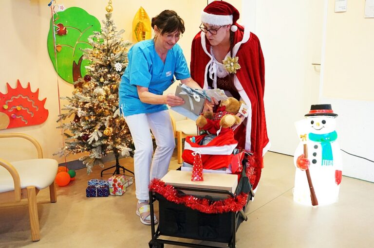 Als zünftige Weihnachtsfrau brachte Anne Plekat am 22.12.2025, Geschenke auf unsere Kinderstation. Steffi Jendretzky (links), Stationsleitung der Kinderstation, freute sich sehr über diese Idee. Anne